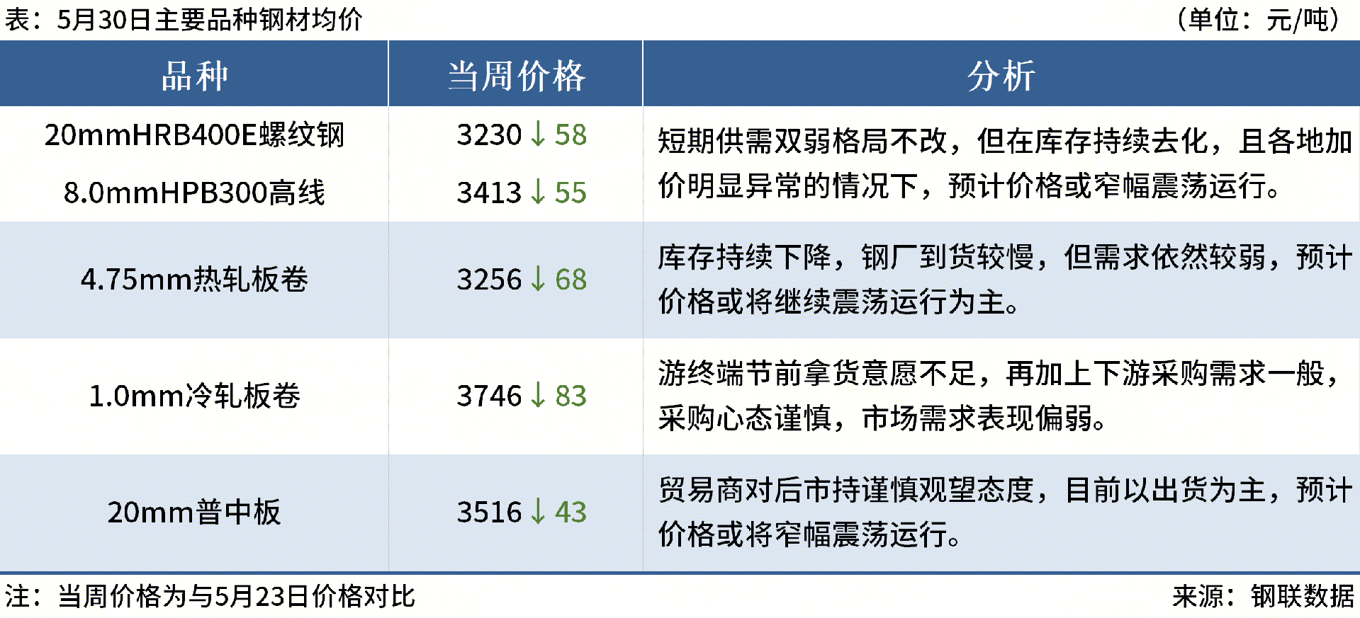 ◎6月1日沙鋼出臺6月上旬出廠(chǎng)價(jià),螺紋鋼下調50元/噸,盤(pán)螺價(jià)格平穩,現螺紋鋼3250元/噸,盤(pán)螺價(jià)格3410元/噸。
