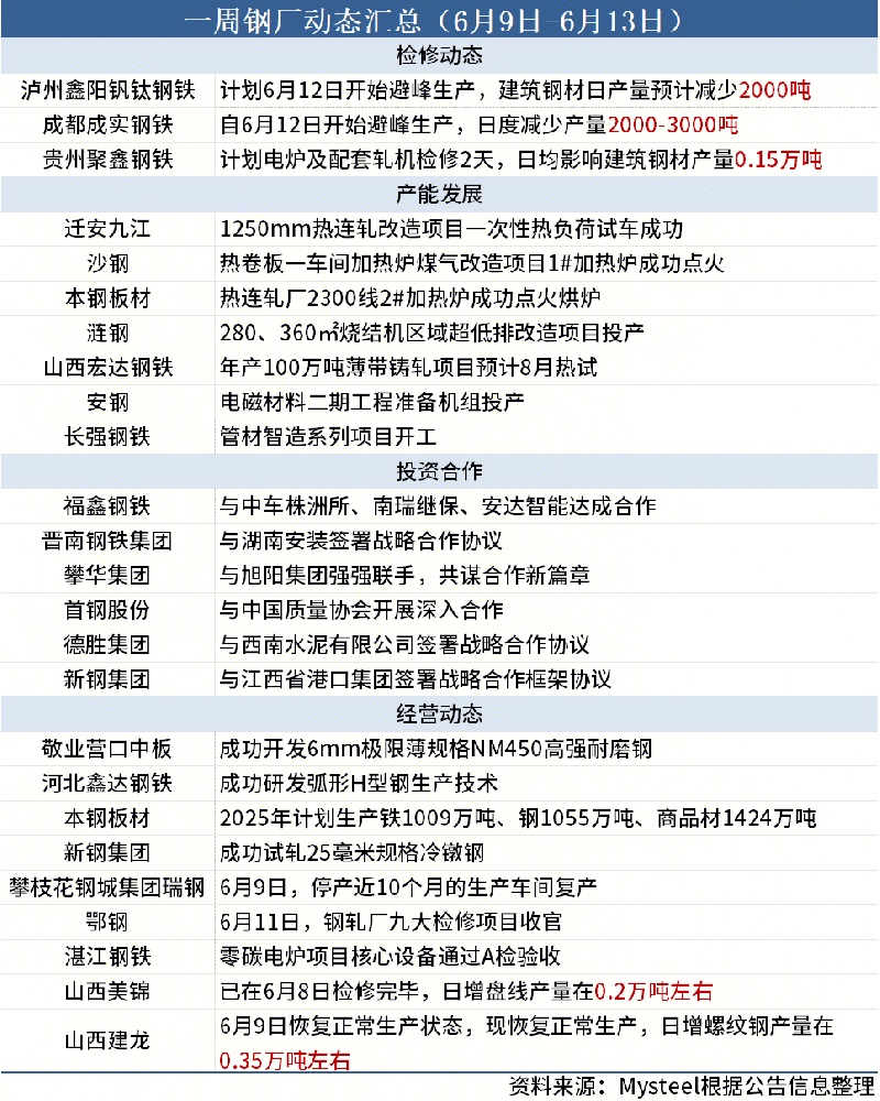 據Mysteel不完全統計,本周(6月9日-6月13日)3家鋼廠(chǎng)發(fā)布檢修信息,具體如下:
