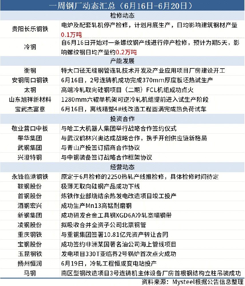 據Mysteel不完全統計,本周(6月16日-6月20日)2家鋼廠(chǎng)發(fā)布檢修信息,具體如下: