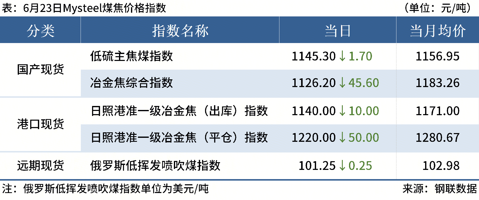 ◎ 6月23日,焦炭市場(chǎng)價(jià)格偏弱運行,第四輪降價(jià)落地。河北山東主流鋼廠(chǎng)針對焦炭采購價(jià)格下調濕熄50元/噸,干熄55元/噸。
