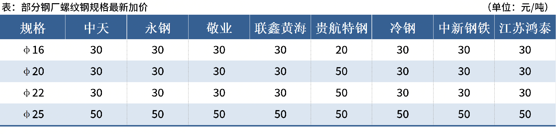 ◎近日部分鋼廠(chǎng)陸續公布通知,決定對螺紋鋼(棒)相關(guān)規格加價(jià)進(jìn)行調整: