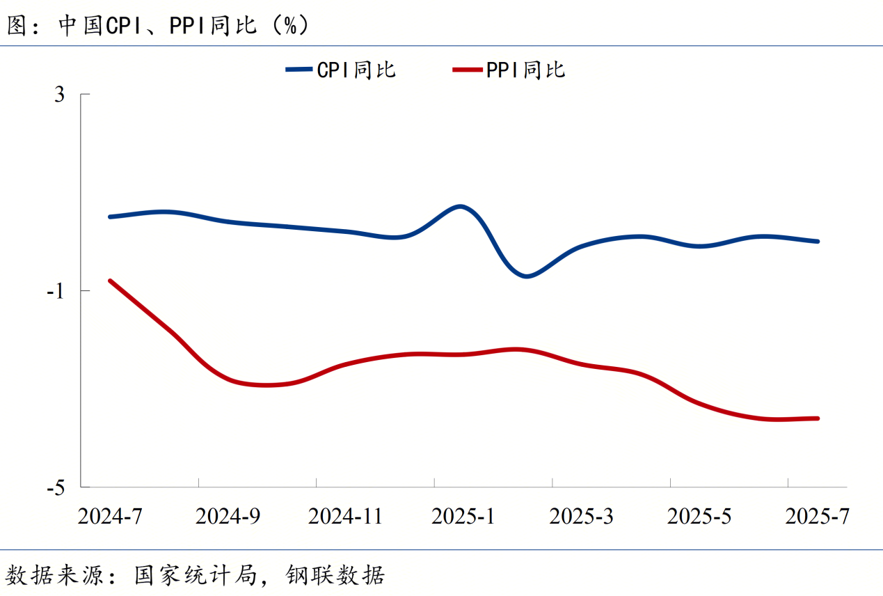 ◎ 國家統計局:7月份,擴內需政策效應持續顯現,CPI環(huán)比由上月下降0.1%轉為上漲0.4%,同比持平;受季節性因素疊加國際貿易環(huán)境不確定性影響,PPI環(huán)比下降0.2%,環(huán)比降幅比上月收窄0.2個(gè)百分點(diǎn),同比下降3.6%。