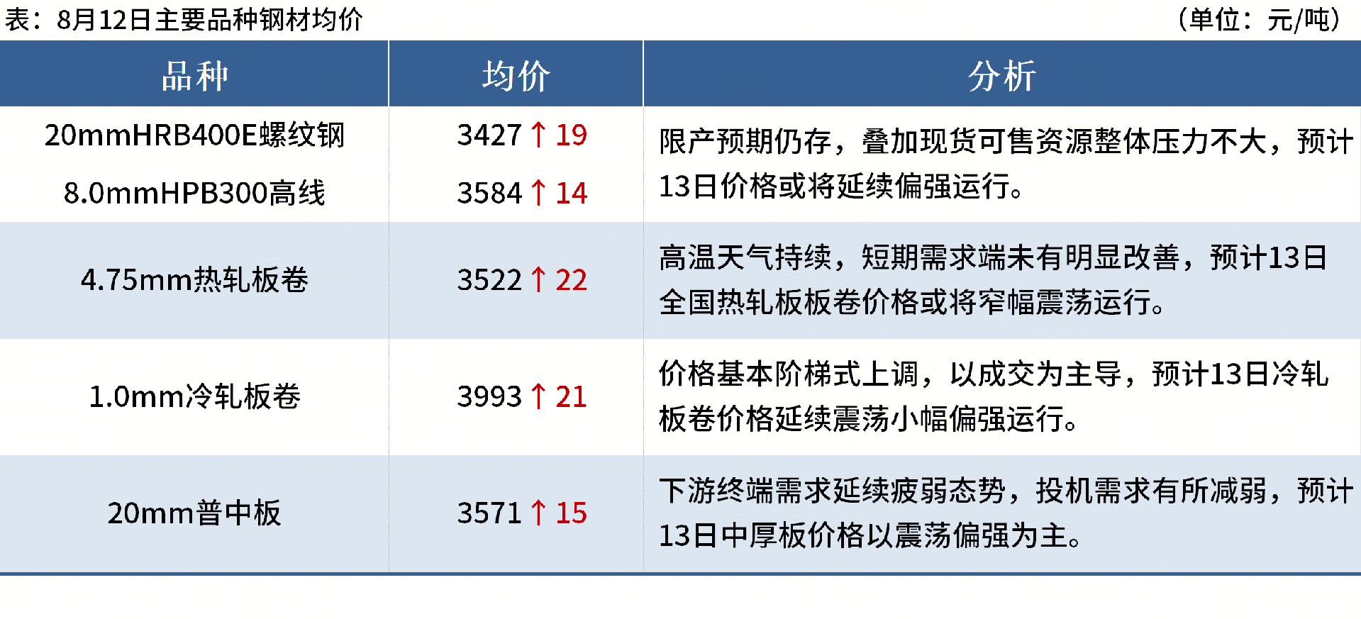 ◎鞍鋼、本鋼、凌鋼同步上調9月份產(chǎn)品價(jià)格。熱軋、線(xiàn)材、螺紋鋼均上調200元/噸,酸洗、冷軋、冷硬、鍍鋅、無(wú)取向硅鋼上調300元/噸。本鋼電鍍鋅、特鋼分別上調300元/噸和230元/噸,凌鋼特鋼上調230元/噸。