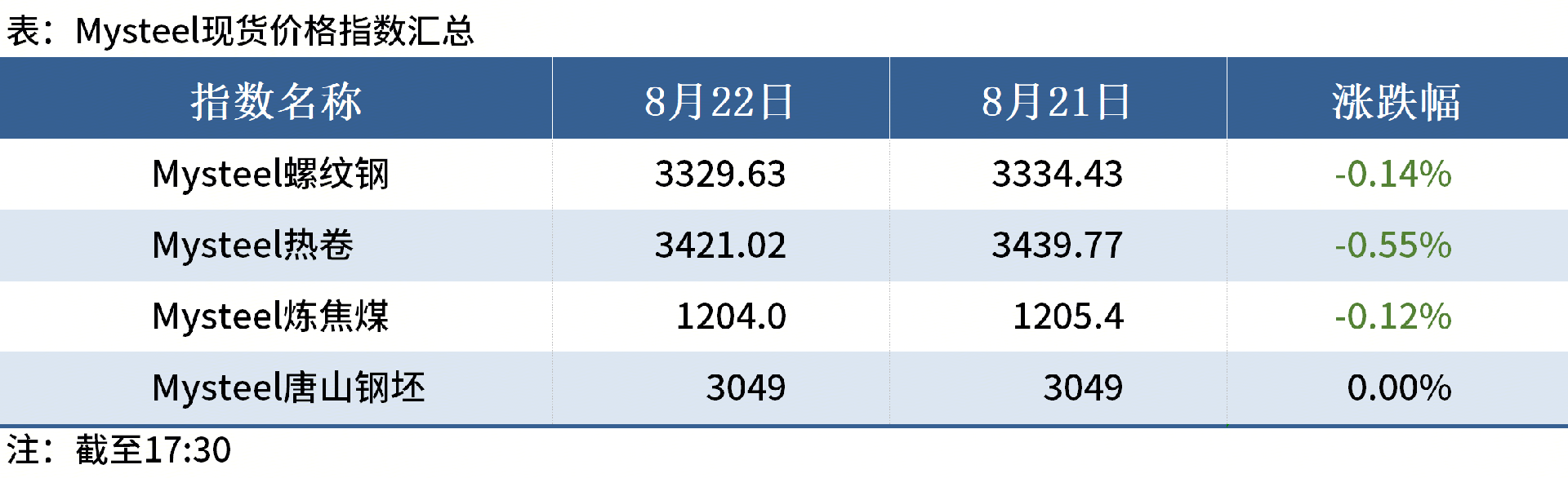 ◎8月22日,76家獨立電弧爐建筑鋼材鋼廠(chǎng)平均成本為3336元/噸,日環(huán)比不變,平均利潤為-93/噸,谷電利潤為6元/噸,日環(huán)比減少4元/噸。