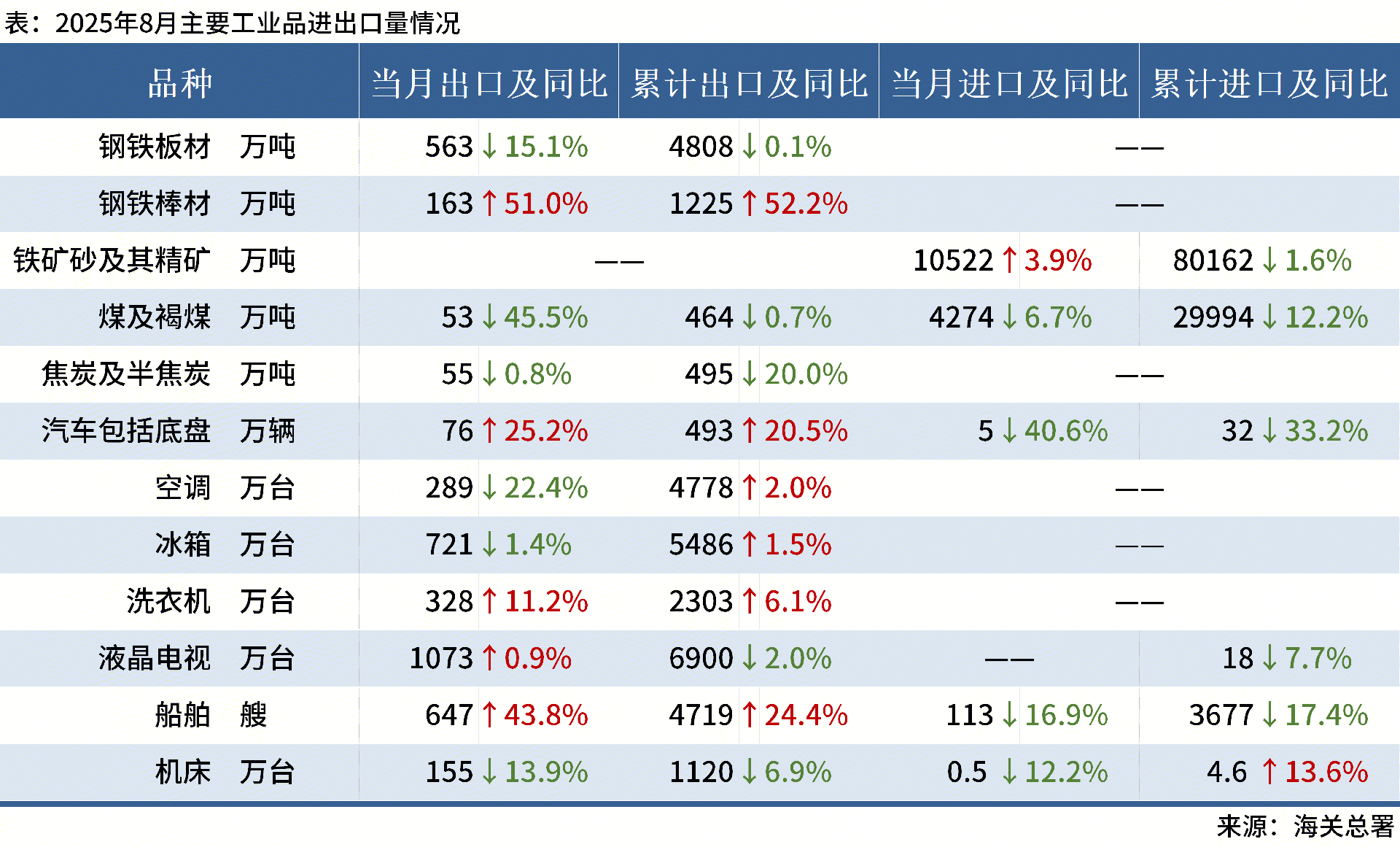 ◎ 海關(guān)總署:8月,中國出口鋼鐵板材563萬(wàn)噸,同比降15.1%;8月,中國出口棒材163萬(wàn)噸,同比增51%。其他主要工業(yè)品進(jìn)出口情況如下: