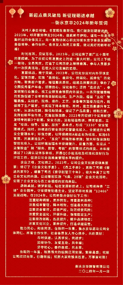 吉陽(yáng)高照、鑼鼓喧天、舞獅歡騰。2023年12月8日,公司按照集團精神指示隆重舉行以“賡續奮進(jìn) 鑄夢(mèng)京華”為主題的三十周年慶典活動(dòng)。政府領(lǐng)導、合作伙伴及職工代表1800余人齊聚衡水京華,共襄盛舉! 慶典儀式上首先由總經(jīng)理溫朝福致開(kāi)幕詞。在致辭中,溫總首先代表公司創(chuàng )始人杜雙華先生和公司領(lǐng)導班子,向長(cháng)久以來(lái)關(guān)心和支持我們的···